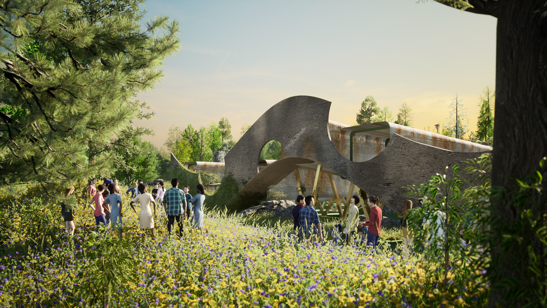 The images were produced to showcase the scale of the proposal and its interaction with the site weather conditions. It is situated in Milwaukee, and as an exercise in parametric design, the structure is completely responsive to the changes in its parameters like length, width, height and the human occupancy levels. The script automates the structural