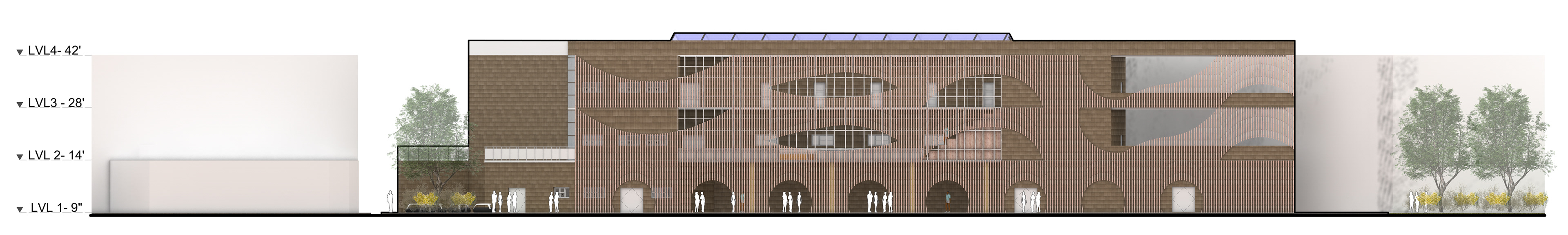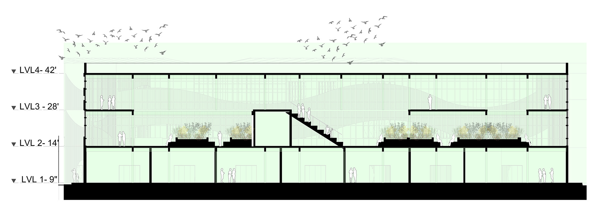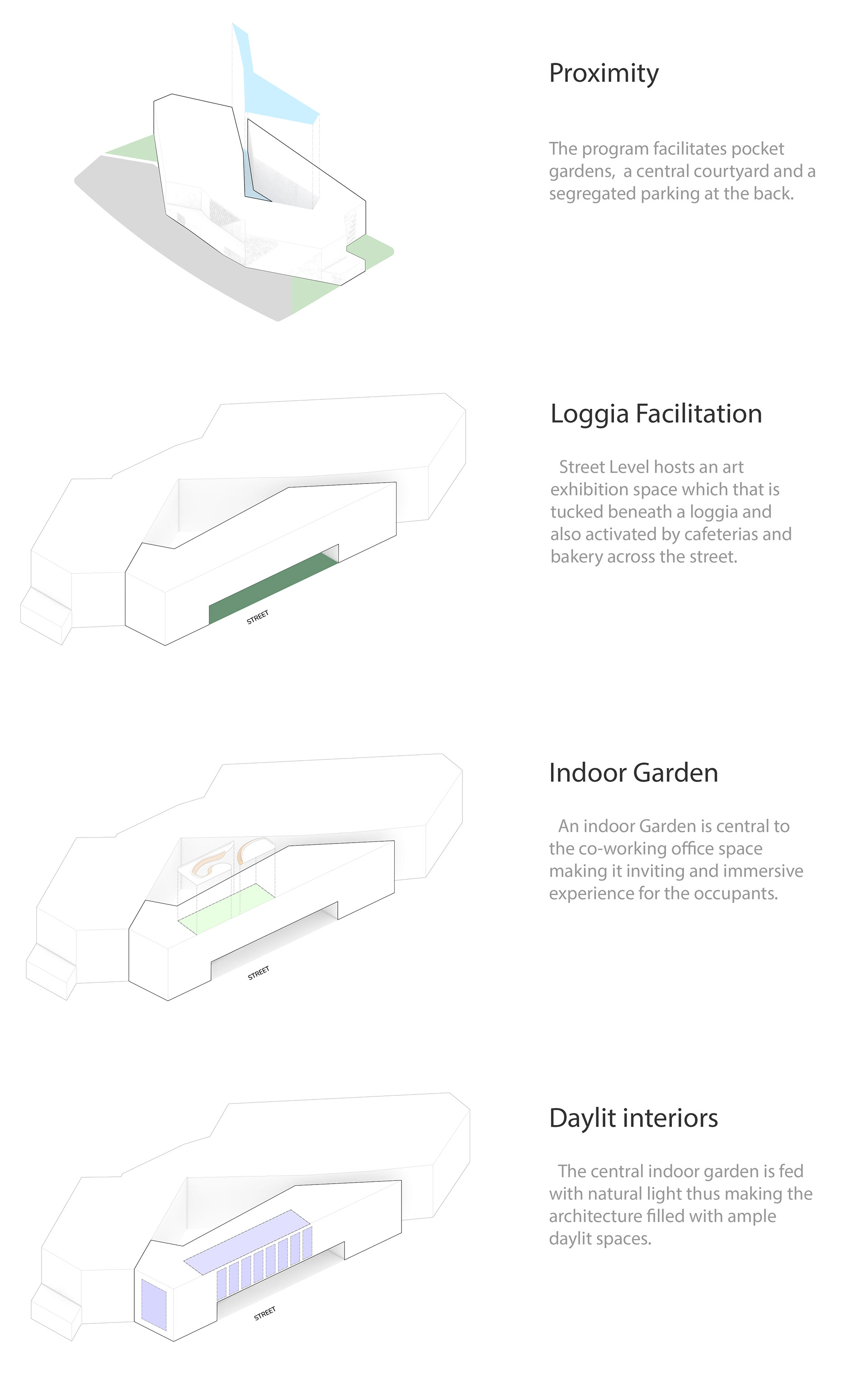 of pedestrian and vehicular circulation, curating a seamless experience, that connects with the pocket gardens, courtyard, indoor garden, and a street level art exhibition.